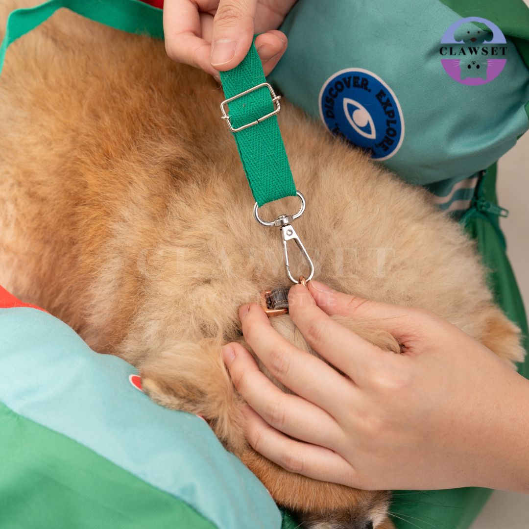 Dilengkapi dengan kait pengaman yang bisa dipasang ke tali leher anabul serta sabuk pengaman yang dapat dilepas.